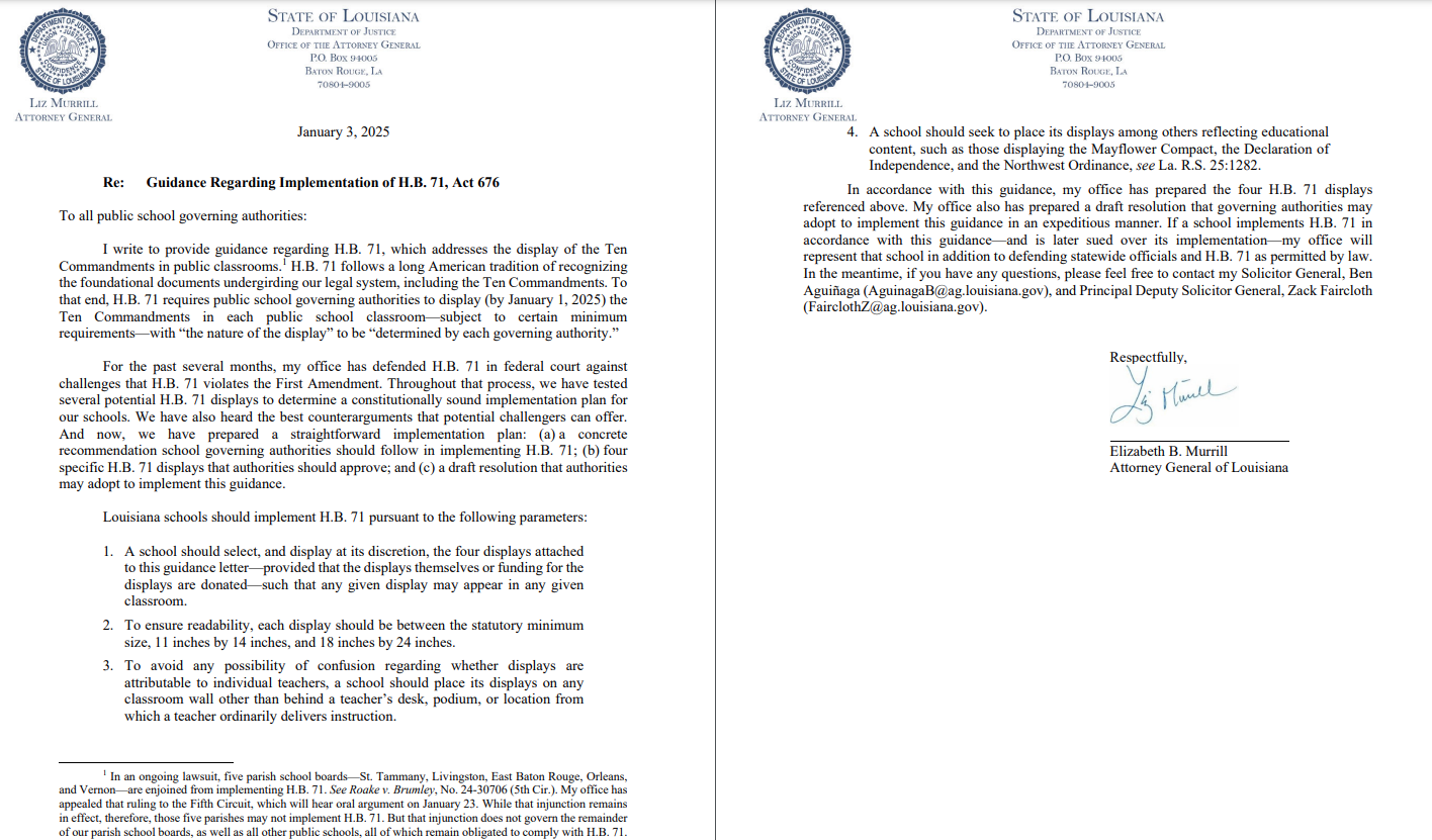 “I have issued guidance to our public schools regarding compliance with Louisiana’s Ten Commandments law, H.B. 71. As I have repeatedly said, H.B. 71 is plainly constitutional because there are constitutionally sound ways to implement it. My guidance letter explains as much and includes four specific displays, as well as a draft resolution that schools may use to adopt this guidance. I look forward to working with our schools and continuing to defend H.B. 71’s constitutionality,” said Attorney General Liz Murrill.